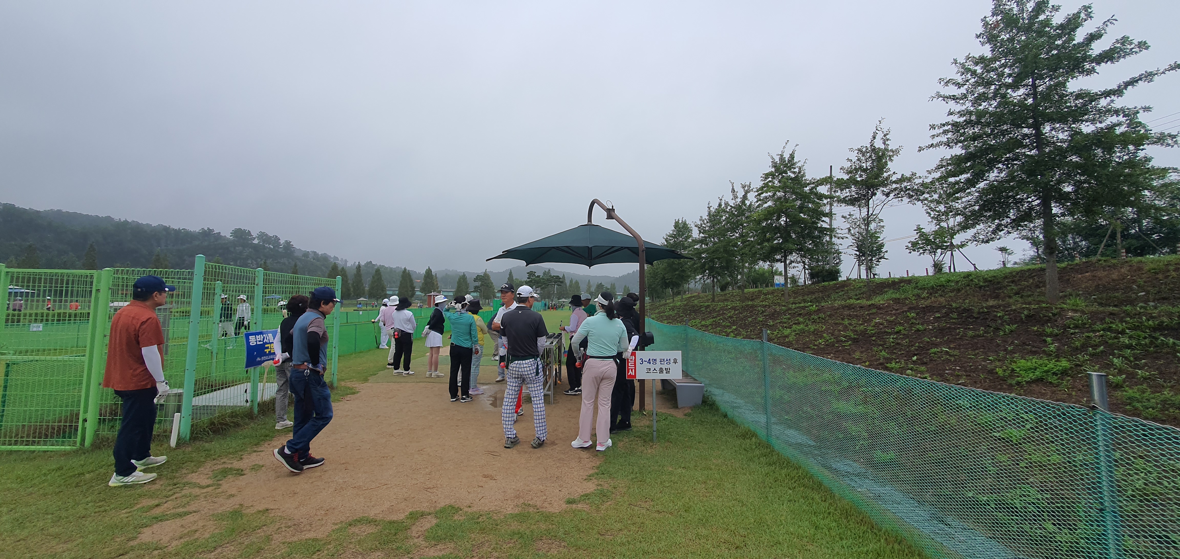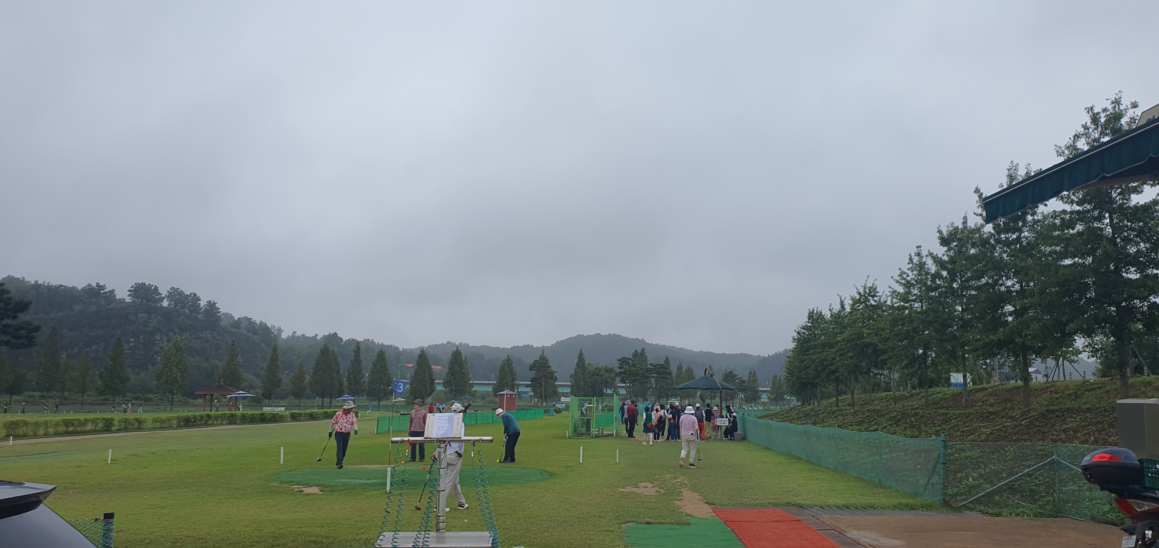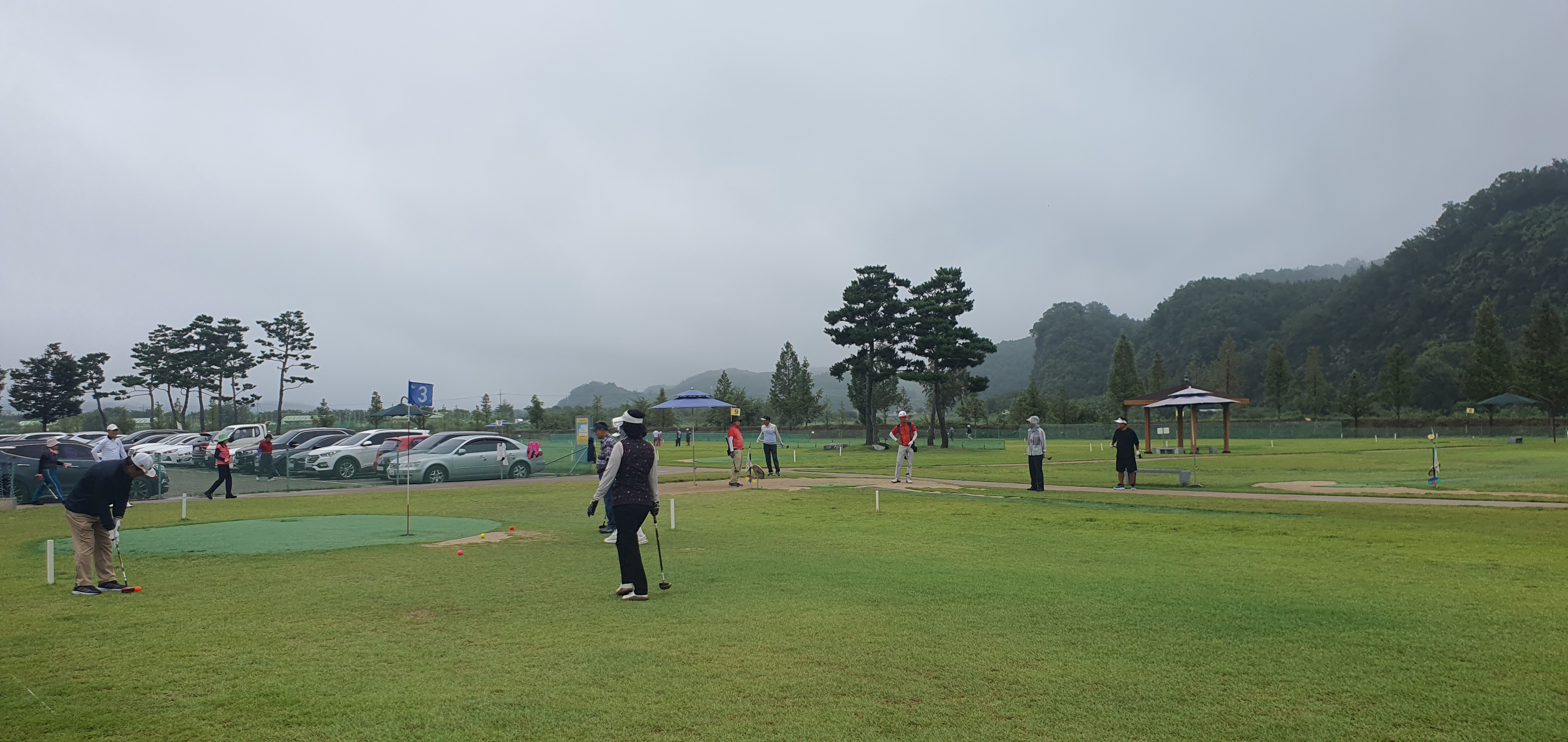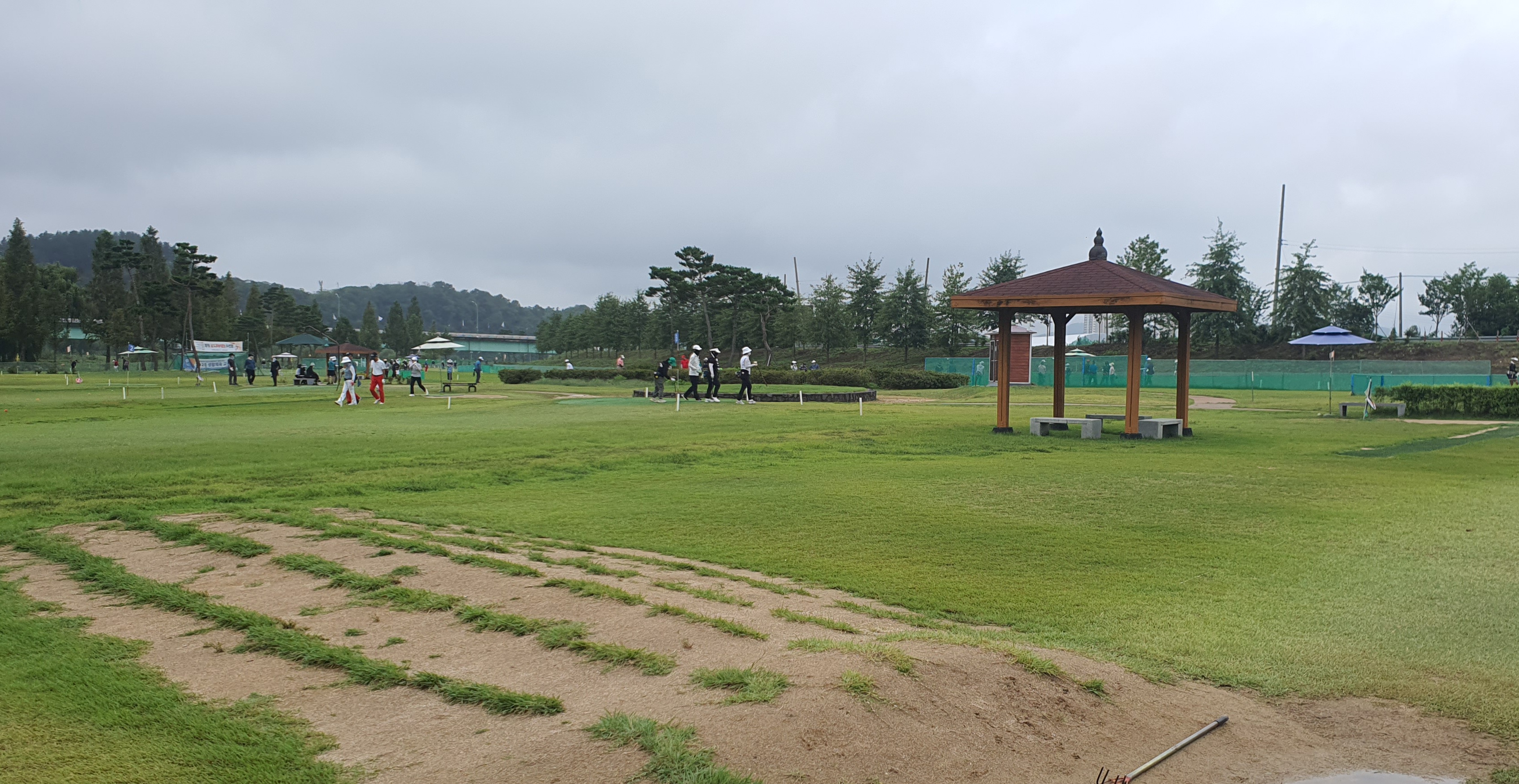조교파크골프장은 각 코스 중간에 정자 형태의 쉼터가 있어 쉬어가며 경기를 할 수 있으며 연습타석이