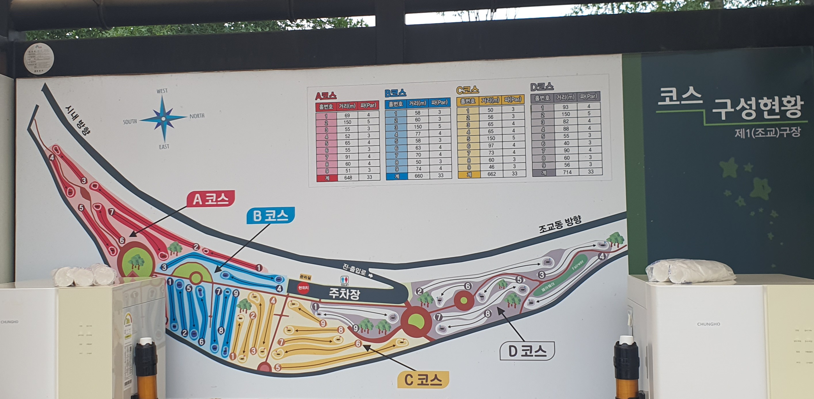 각 9홀로 이루어진 A, B, C, D 네 코스에는 천연 잔디, 인조 잔디, 모래 벙커,헤저드가 적절하게 구성돼